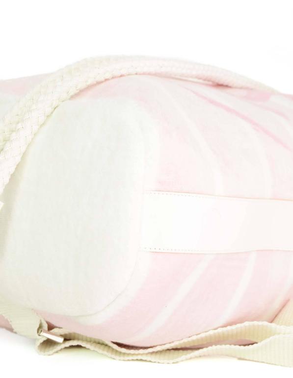Pink and white chanel beach set including terry towel and matching beach bag featuring cc logo throughout.